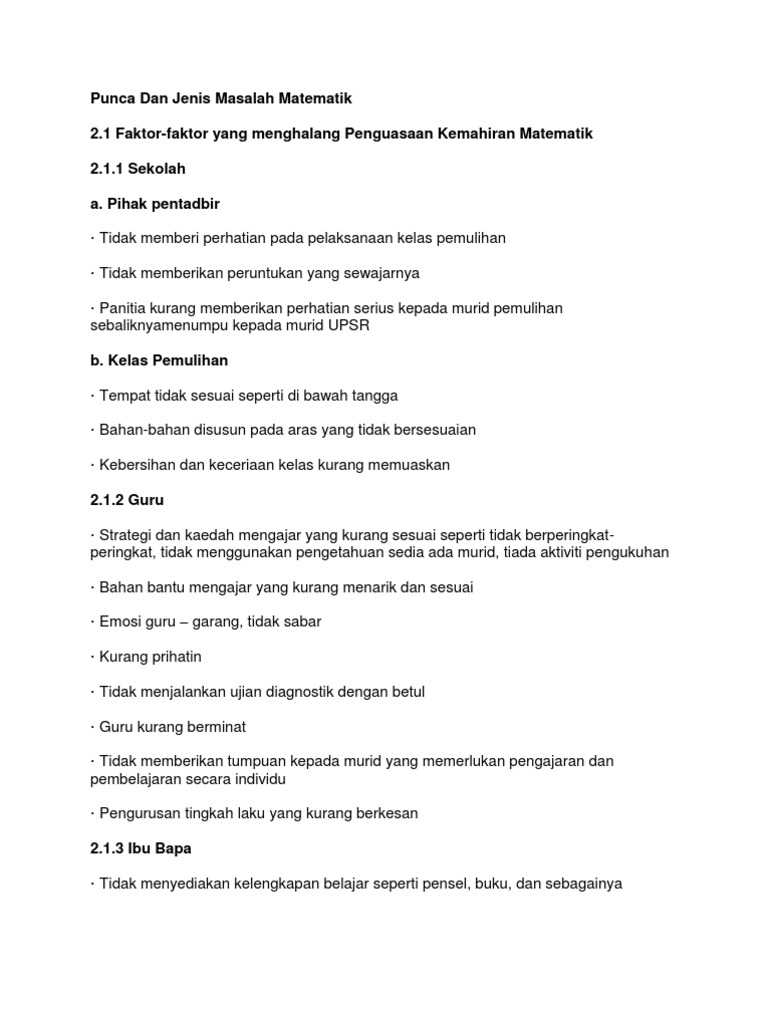 30 PERNYATAAN MASALAH Kajian ini cuba untuk melihat punca kelemahan pelajar dengan memfokuskan kepada minat pelajar dan sikap ibu bapa terhadap prestasi matematik terbaik pelajar Tahun 1 2. Jika tidak dilatih kemahiran ini maka menjadi suatu kesukaran bagi mereka untuk menjawab soalan. Minat di sini bermaksud tertarik kepada matematik atau merasa ingin memberi perhatian kepadanya.